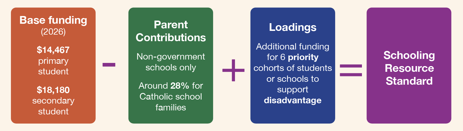 The SRS benchmark establishes the minimum cost – known as ‘Base Funding’ – of educating a student. Every student regardless of where they go to school gets the same base funding – $14,467 for a primary student and $18,180 for a secondary student.